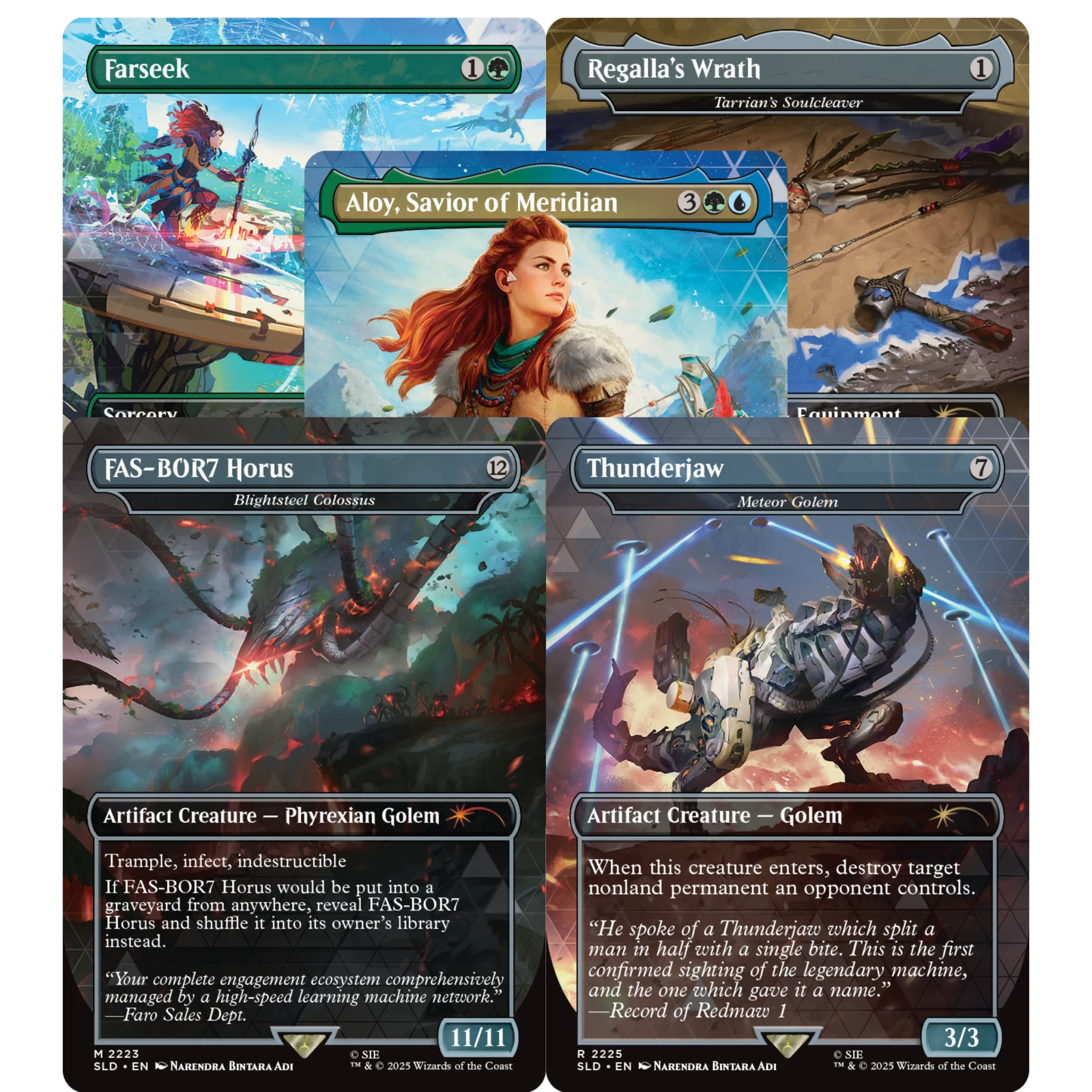 Oltre a una nuovissima carta Magic che raffigura la più grande cacciatrice di macchine del mondo, il drop Secret Lair x Horizon: Into the Forbidden West presenta anche le impressionanti macchine colossali per cui la serie è nota. Ottenete la vista di un Collolungo con Farseek, gioca Blightsteel Colossus come l’antica macchina da guerra “FAS-BOR7 Horus,” o Meteor Golem a “Thunderjaw.” E con il Tarrian’s Soulcleaver come l’arco “Regalla’s Wrath” che Aloy ha reclamato al Kulrut, puoi essere certo che la Salvatrice di Meridian sarà completamente equipaggiata per il viaggio nell’Ovest Proibito.